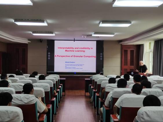 Witold Pedrycz教授报告主题是《Interpretability and credibility in Machine Learning: A Perspective of Granular Computing》,主要讲授机器人学习模型产生结果可解释性和可信度问题。Witold Pedrycz教授提出粒度计算方法解决此问题,并详细阐述了基于规则的计算领域内讨论了置信/预测区间、机器学习模型的粒度嵌入、粒度高斯过程模型等代表性方法。报告过程中,Witold Pedrycz教授透彻深入地阐释相关知识理论,使学生们快速理解讲授内容,并与同学进行问答交流,解答学生的疑惑。